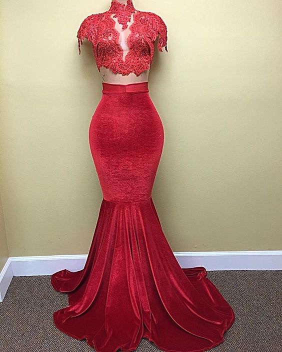 Two Piece Prom Dresses Sexy High Neck Cap Sleeves Lace Velvet Mermaid Prom Party Dresses E13