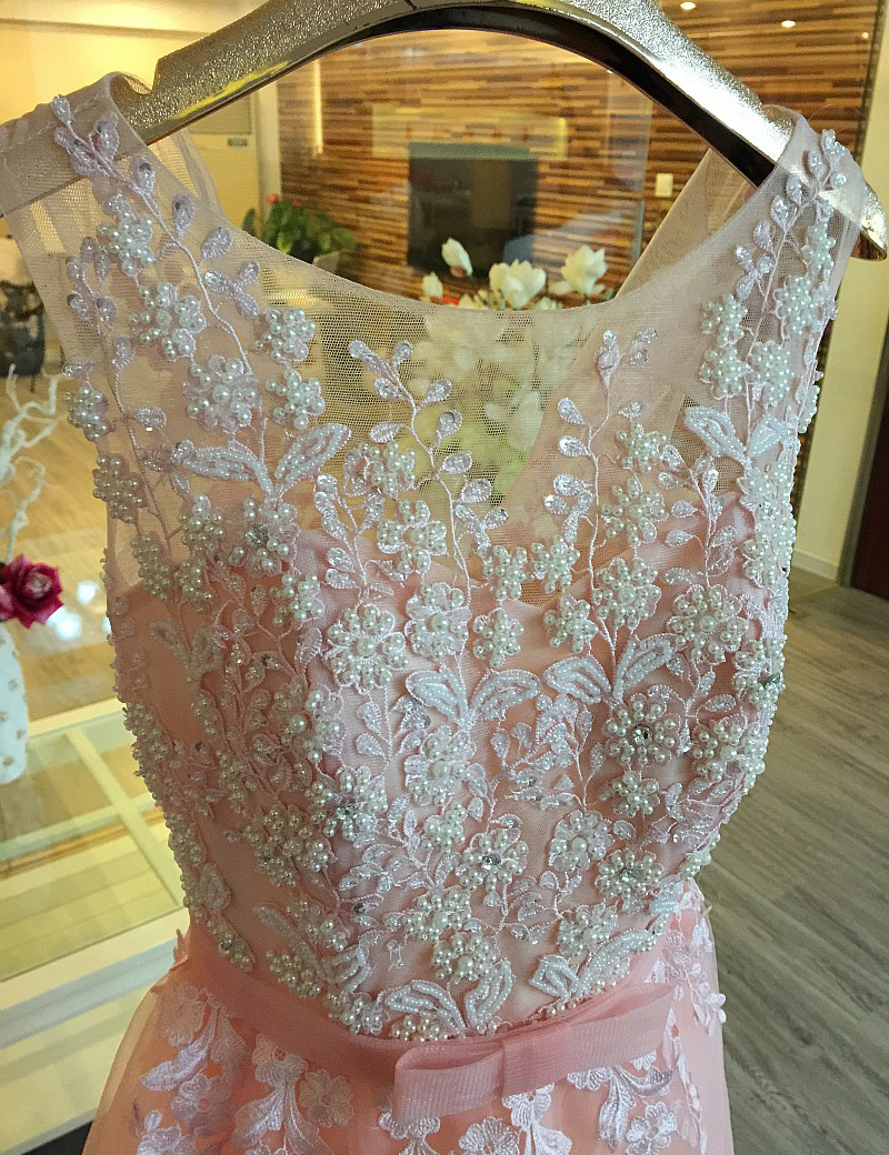 Pink A-line Backless Long Lace Appliques Pearls Prom Evening Dress E70