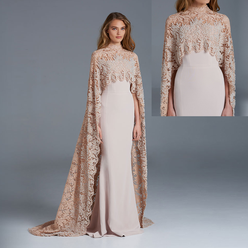 Elegant High Neck Lace Cloak Evening Dresses Long Mermaid Beaded Ceystal Formal Prom Dress Vestido De Festa E86