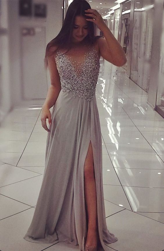 Luxury Beaded Crystal High Slit Prom Dresses Long Chiffon Prom Evening Dress P15