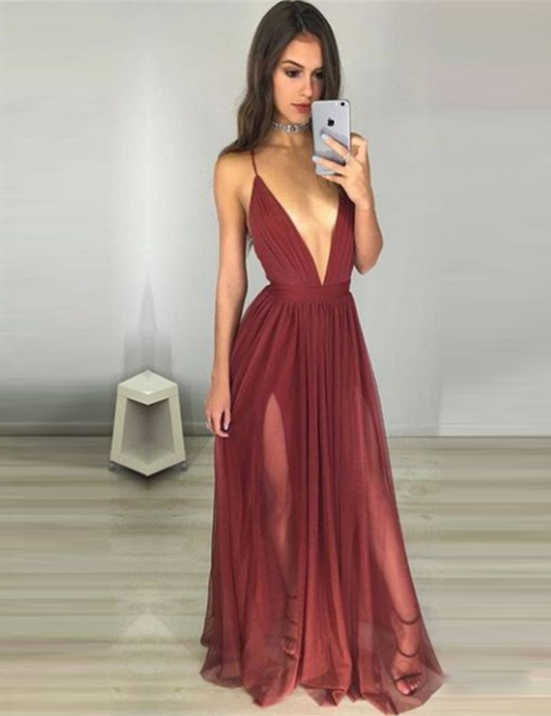 Simple Sexy Backless Deep V-neck High Slit Long Spaghetti Straps Evening Prom Dresses P25