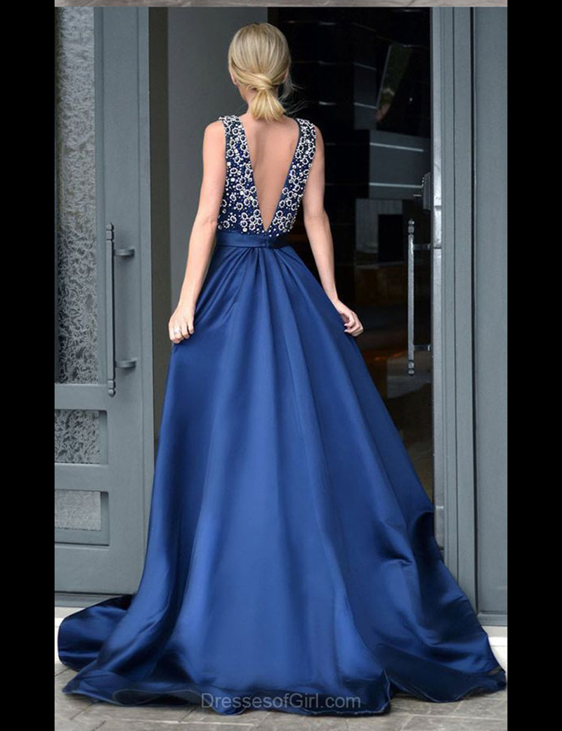 Gorgeous A-line Deep V-neck Backless Long Beaded Rhinestones Prom Evening Dress Navy Blue Prom Formal Dresses