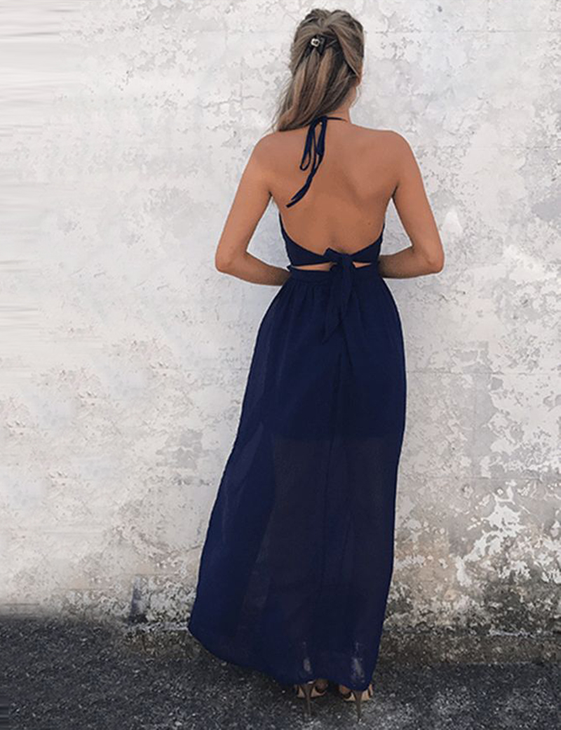 Navy Blue Prom Dresses Sexy Open Back Halter Chiffon Prom Party Evening Dresses P43