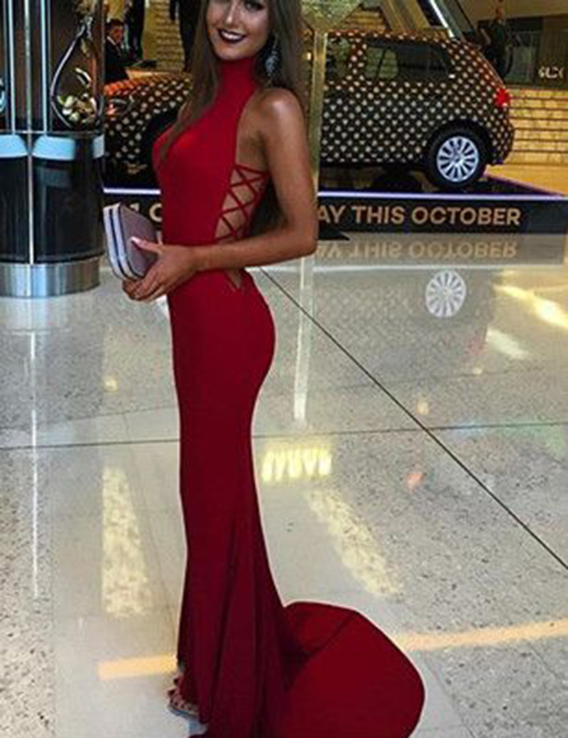 Red High Neck Mermaid Prom Dresses 2017 Long Plus Size Prom Party Dresses P65