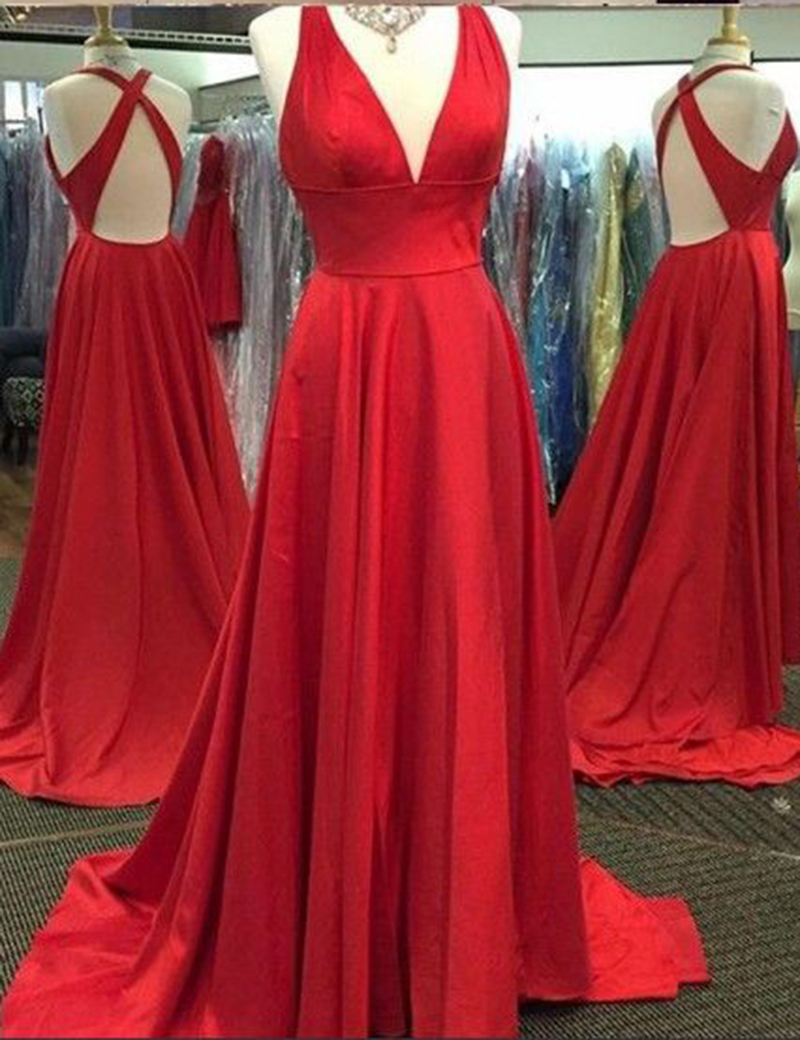 Simple Criss-Cross Deep V-neck A-line Red Prom Evening Dress Plus Size Formal Gown P69
