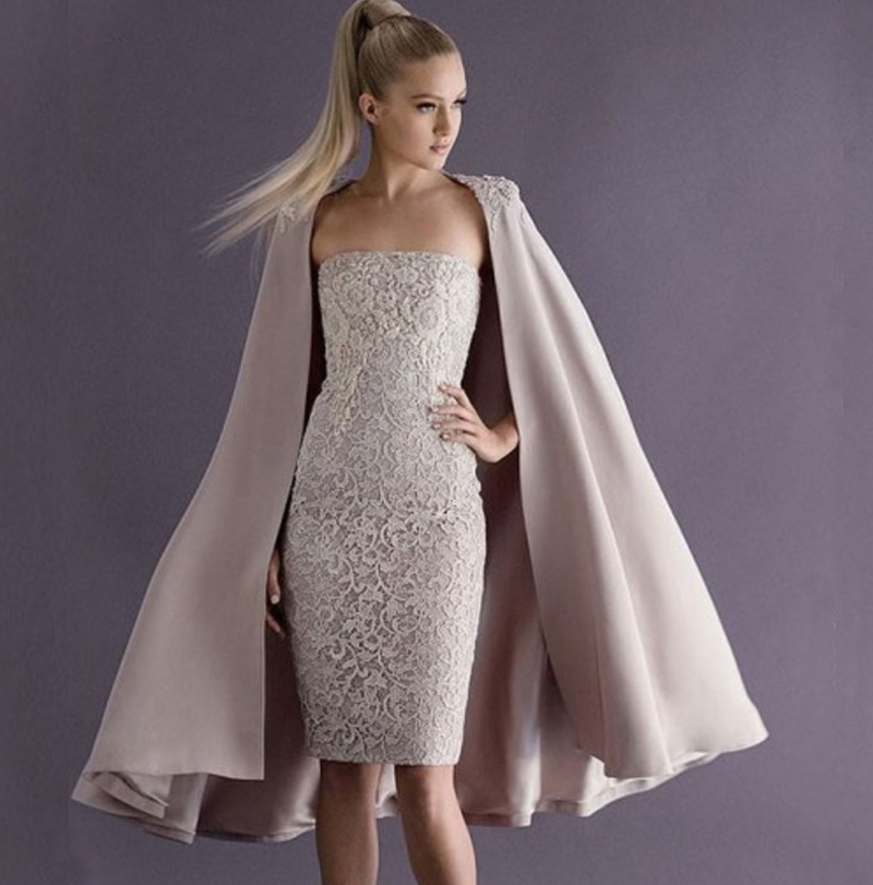 Fashion Sheath Short Lace Beaded Knee Length Prom Party Dresses With Cape
