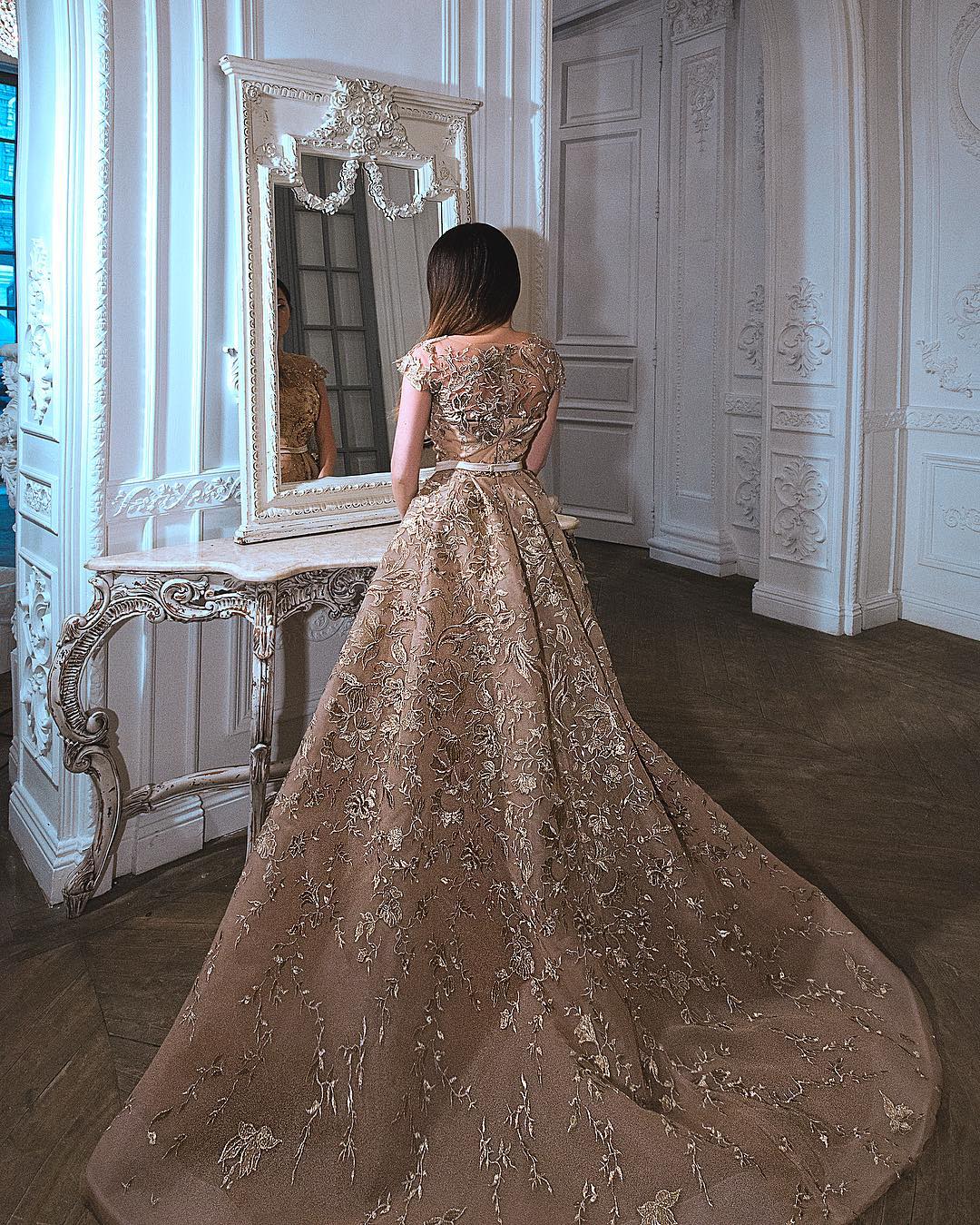 Gold Evening Dress Elegant O-neck Short Sleeves Long Lace Appliques Prom Party Dresses Formal Dress