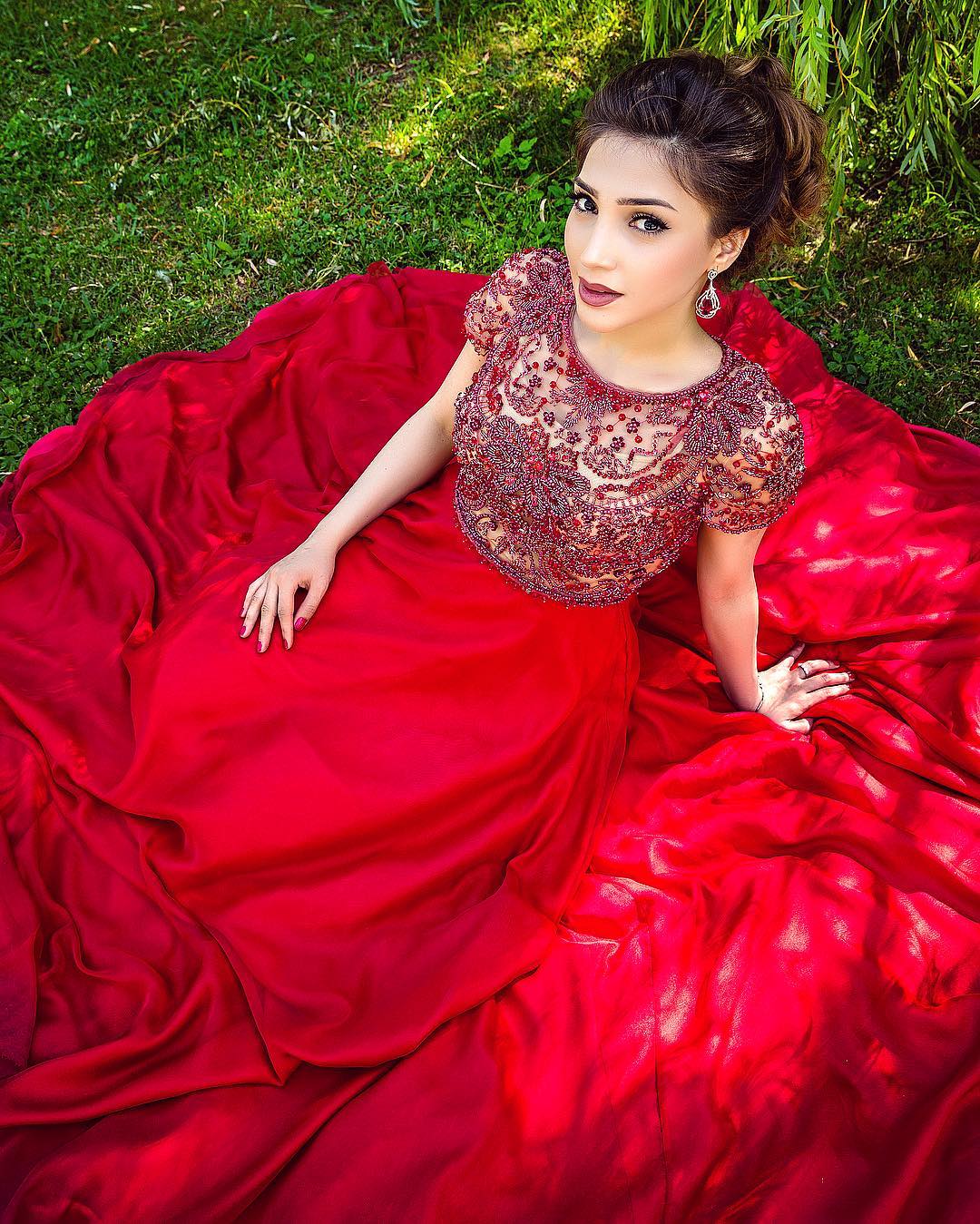 Beaded Prom Dresses Luxury Heavy Beaded Crystal Pearls Short Sleeves A-line Long Chiffon Red Evening Prom Dress E342