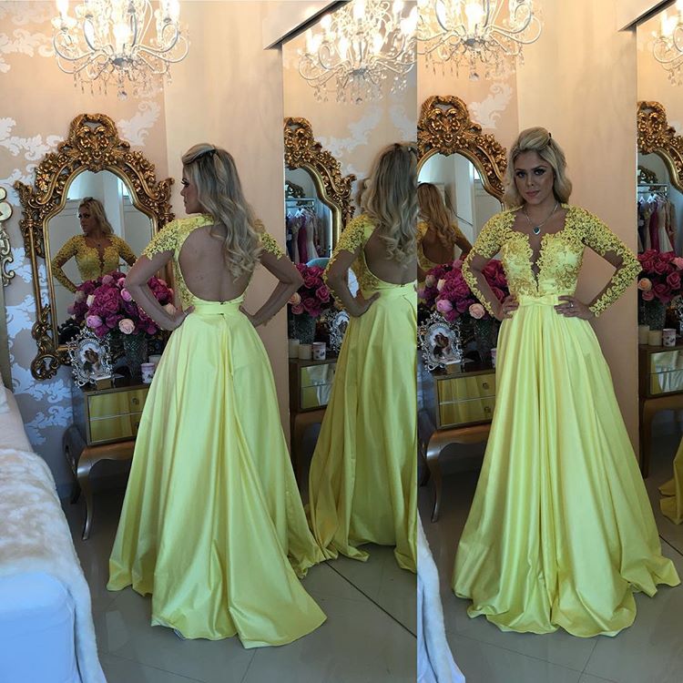 Long Sleeves Lace Evening Prom Dress Elegant O-neck A-line Satin Backless Long Pearls Prom Dress E347