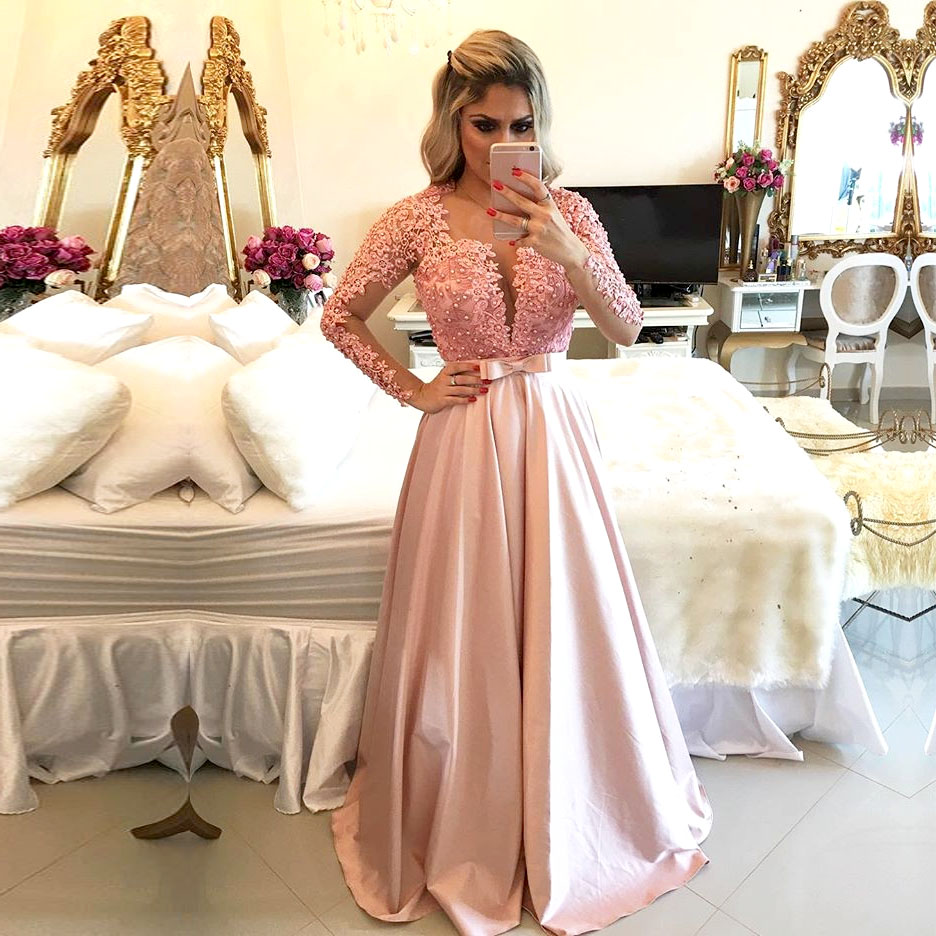 Long Sleeves Lace Evening Prom Dress Elegant O-neck A-line Satin Backless Long Pearls Prom Dress