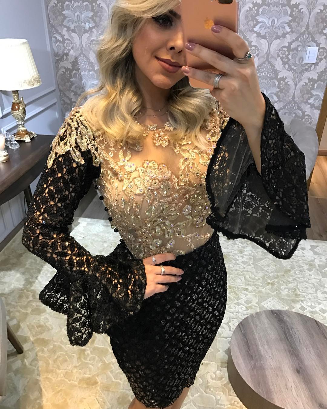 Sexy Backless Long Sleeves Lace Beaded Short Prom Dress Knee Length Prom Party Dresses