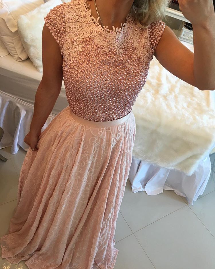 Pink Pearls Prom Dress Elegant A-line O-neck Cap Sleeves Lace Appliques Evening Formal Dress