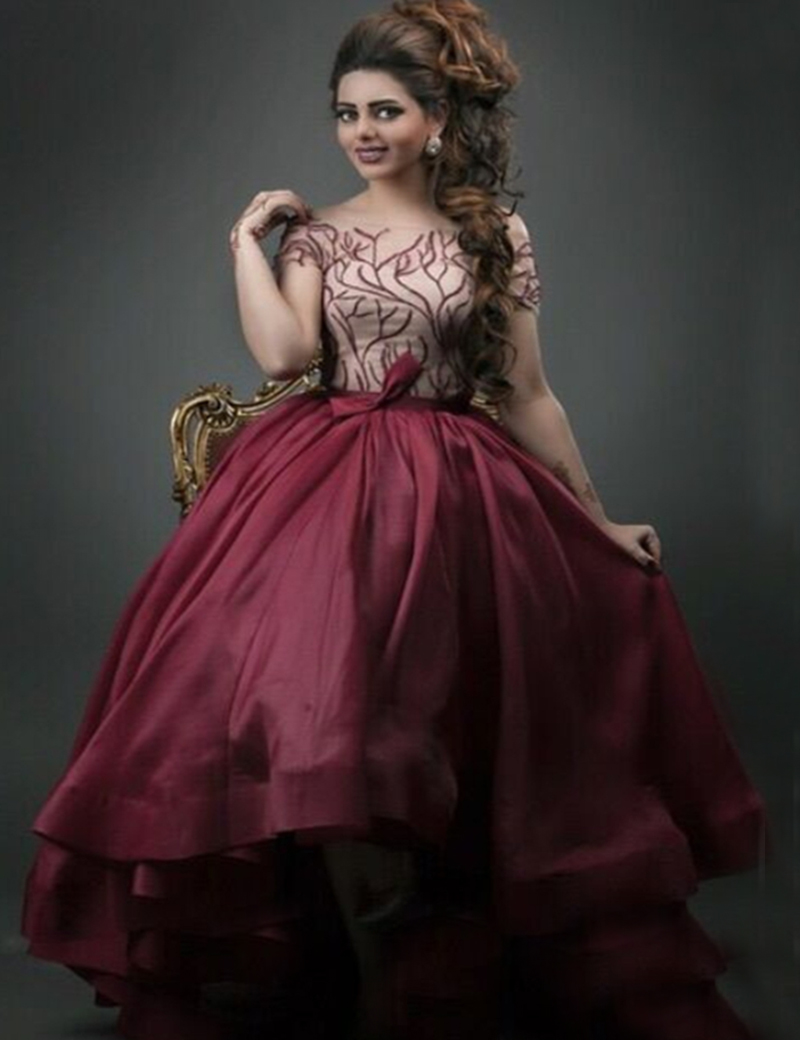 High Low Prom Dresses Elegant O-neck Cap Sleeves Organza Embroidery Beaded Arabic Prom Party Dress E387