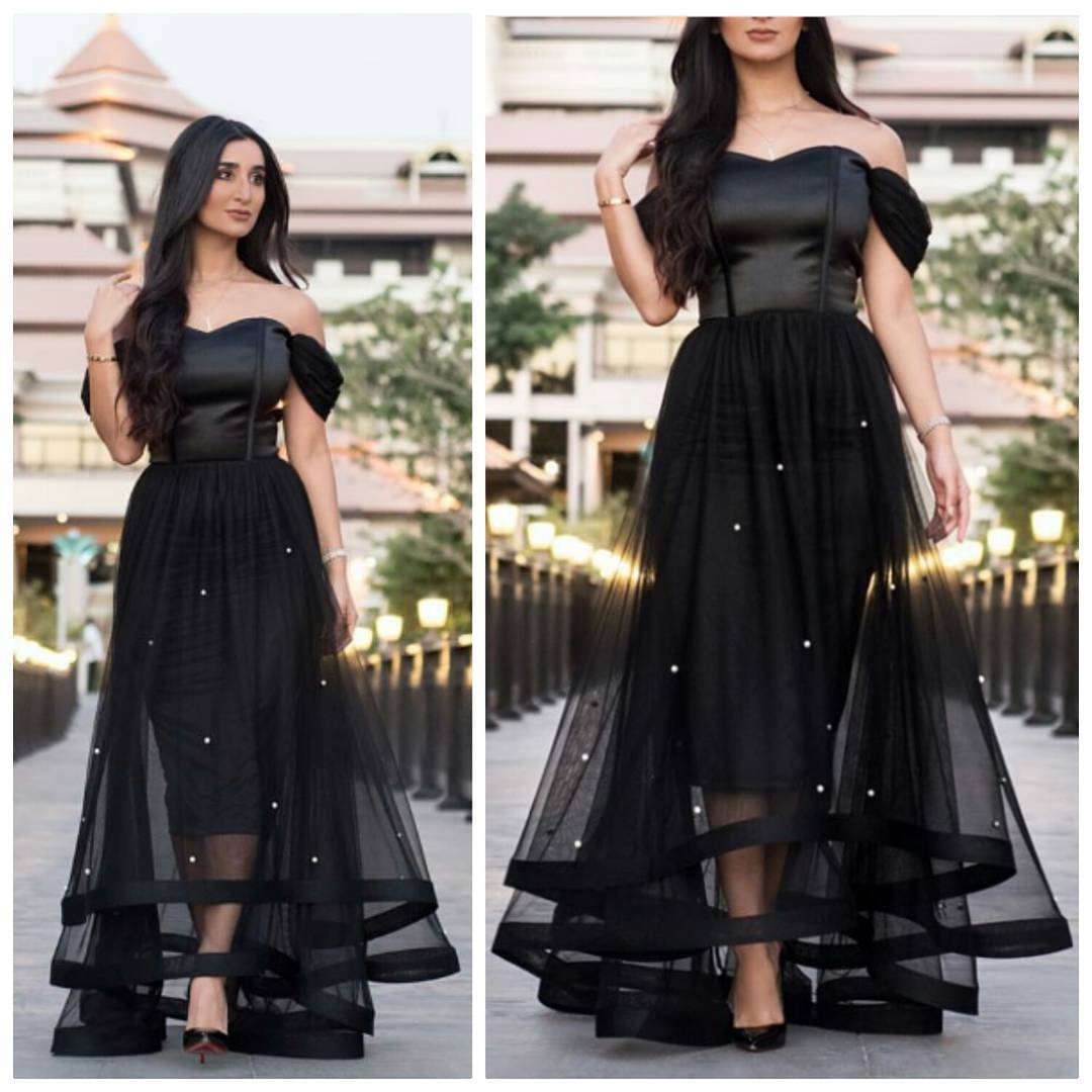 Black Prom Dresses Elegant Off-shoulder Satin Edge Peals Long Prom Party Dress E403
