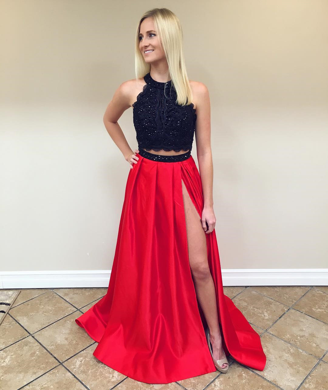 Two Piece Prom Dresses Sexy Halter A-line Backless High Slit Lace Crystal Prom Evening Dress