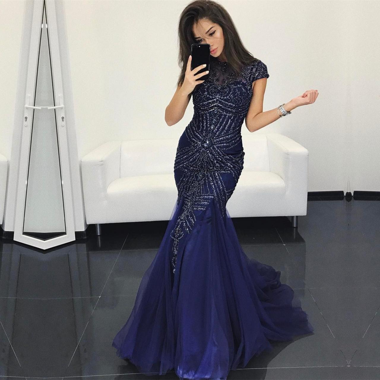 Gorgeous O-neck Cap Sleeves Beading Crystal Rhinestones Navy Blue Mermaid Long Prom Evening Dress