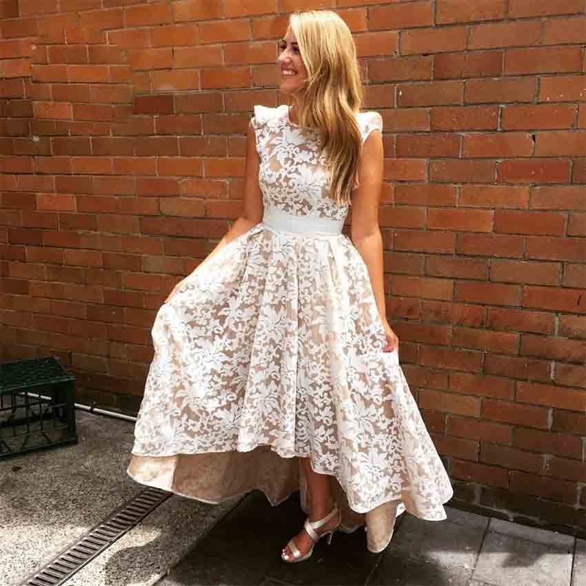 Ivory&Nude High Low Cap Sleeves Lace Prom Evening Dress E229