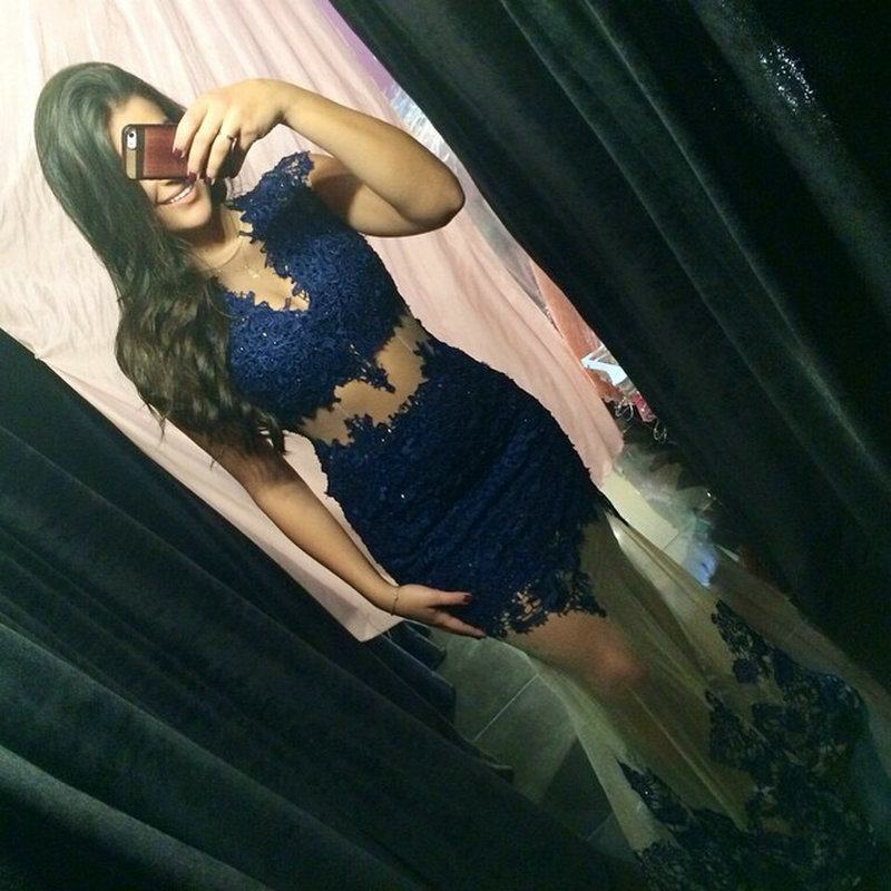 Champagne&Navy Blue Cap Sleeves Long Lace Appliques Beaded Prom Evening Dress E292
