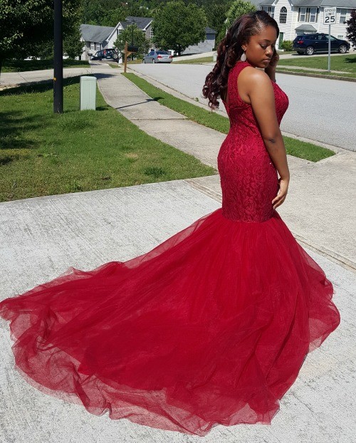 Fashion O-neck Red Long Lace Organza Mermaid Prom Dress Evening Formal Gown