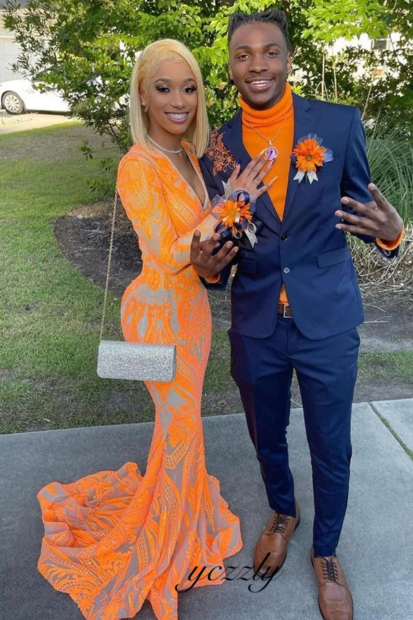 Mermaid Evening Dress Long Sleeves V-neck Lace Appliques Prom Gown YE81