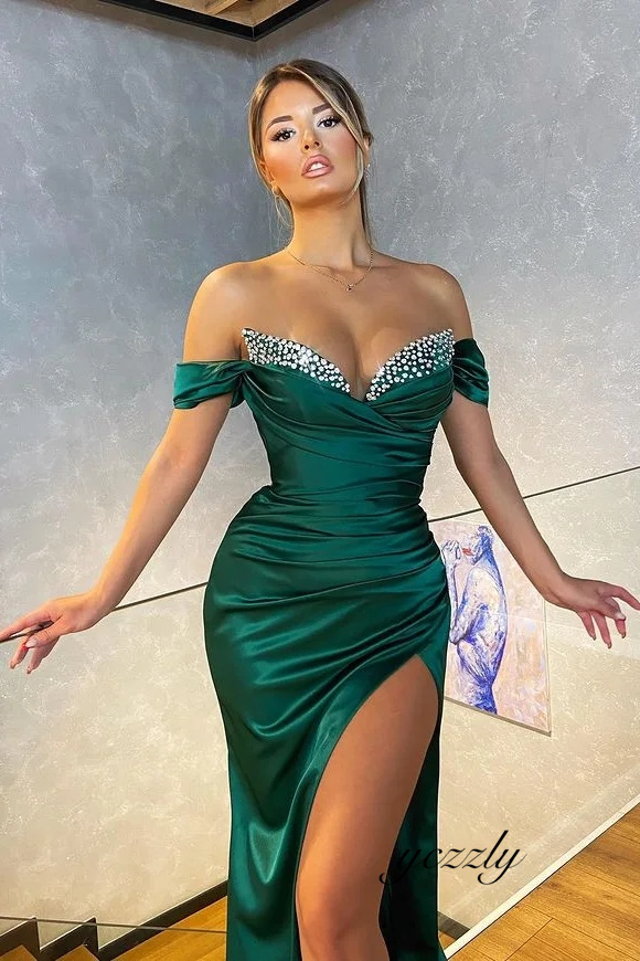 Off the Shoulder Diamond Satin Mermaid Prom Dress With Slit YE66