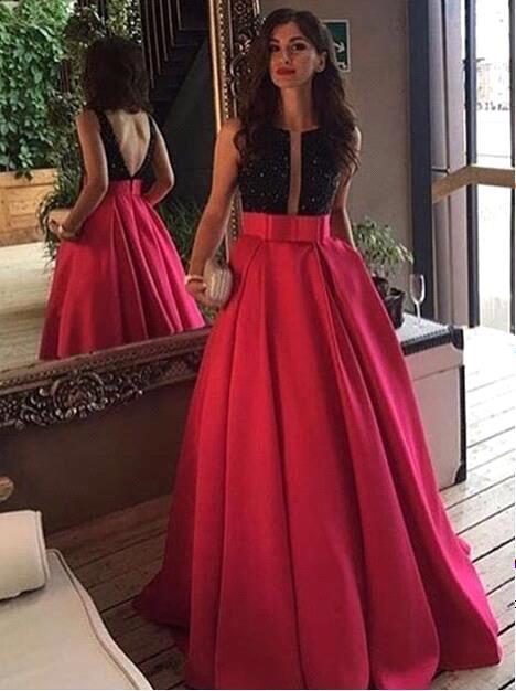 Black and Fuchsia Backless A-line Satin Sequins Prom Evening Dress Long E348