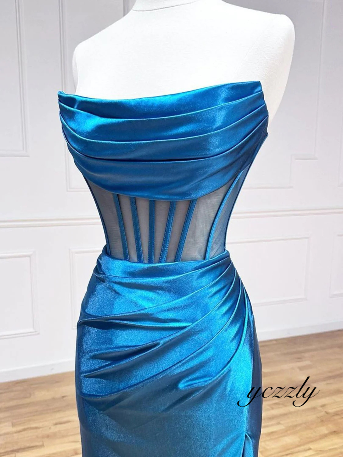 Simple Blue Satin Strapless Mermaid Prom Gown With Slit YE41