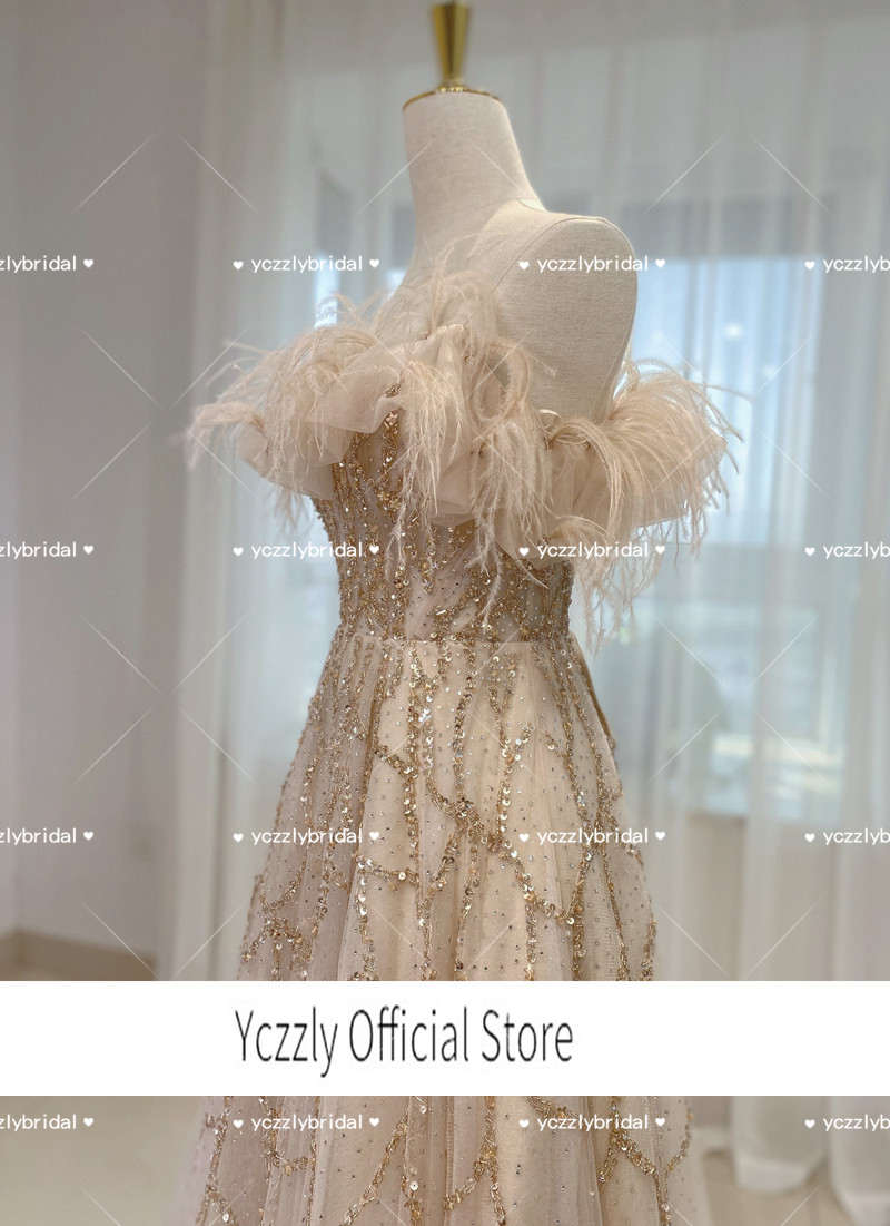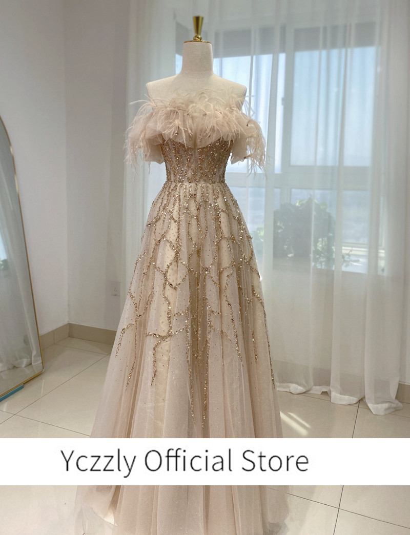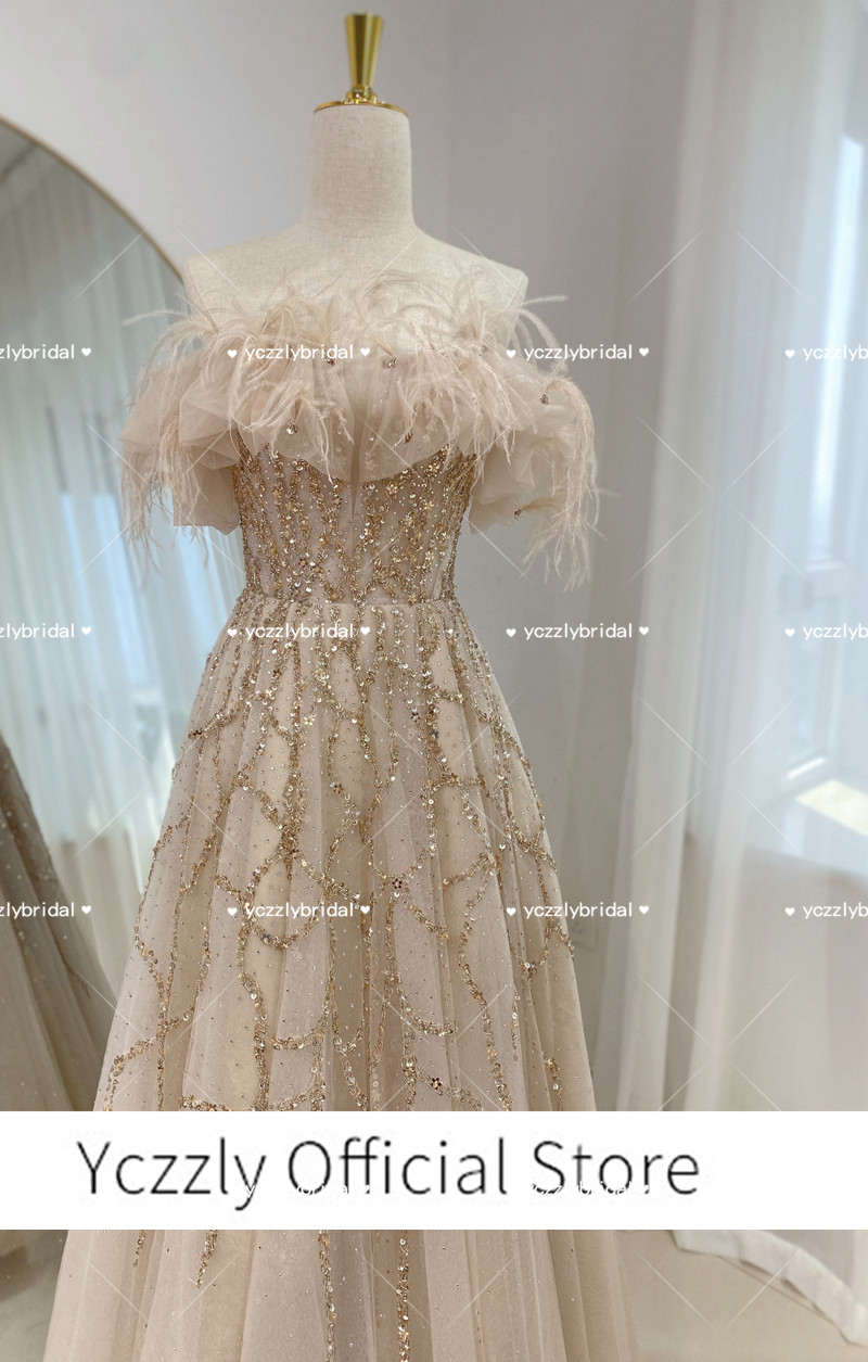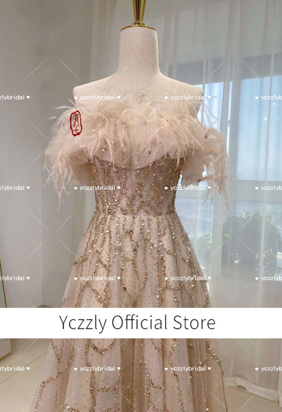 Real Video Exquisite Off-shoulder Champagne Beading Evening Prom Dress With Ostrich Luxury Sequined Party Gown YE09
