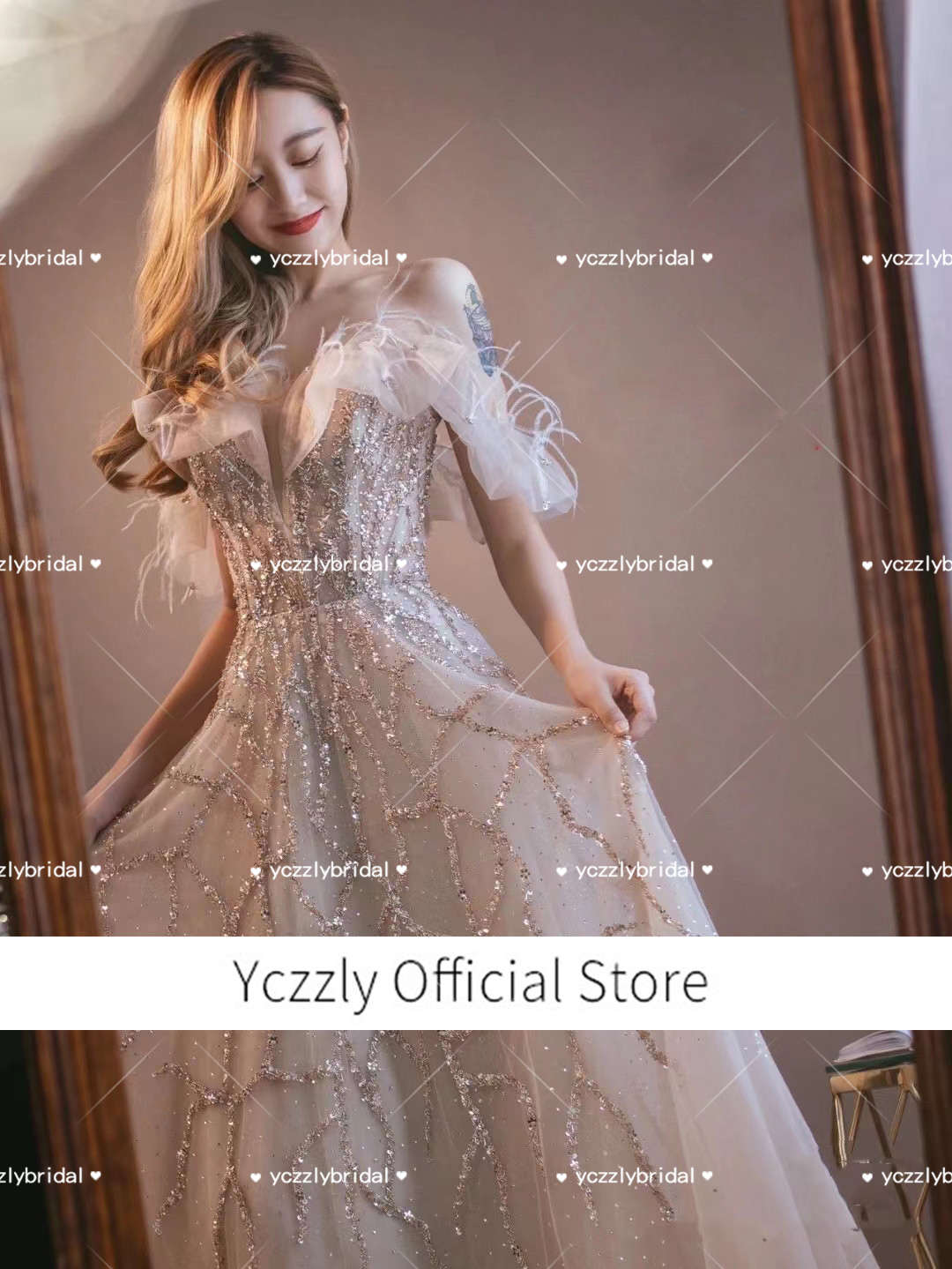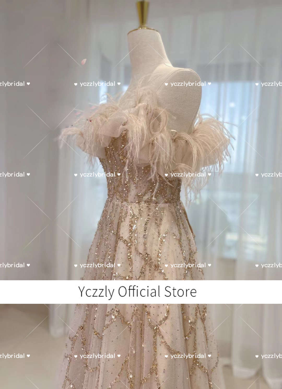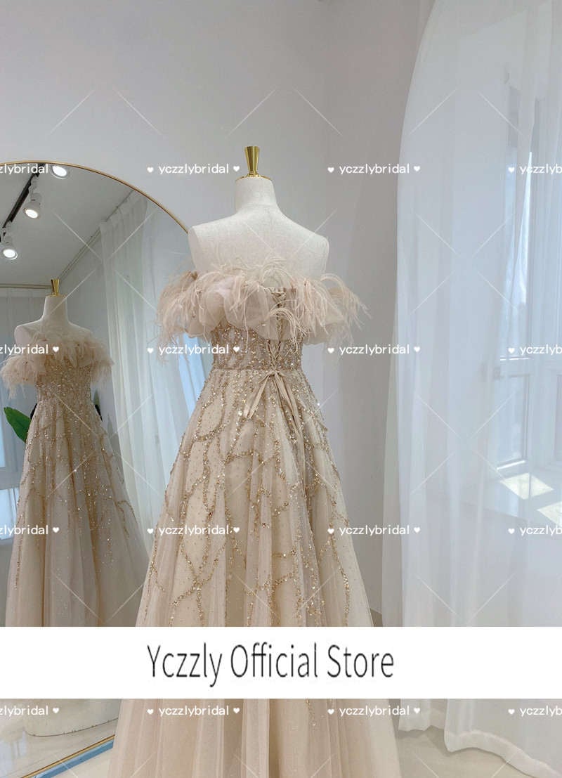 Real Video Exquisite Off-shoulder Champagne Beading Evening Prom Dress With Ostrich Luxury Sequined Party Gown YE09