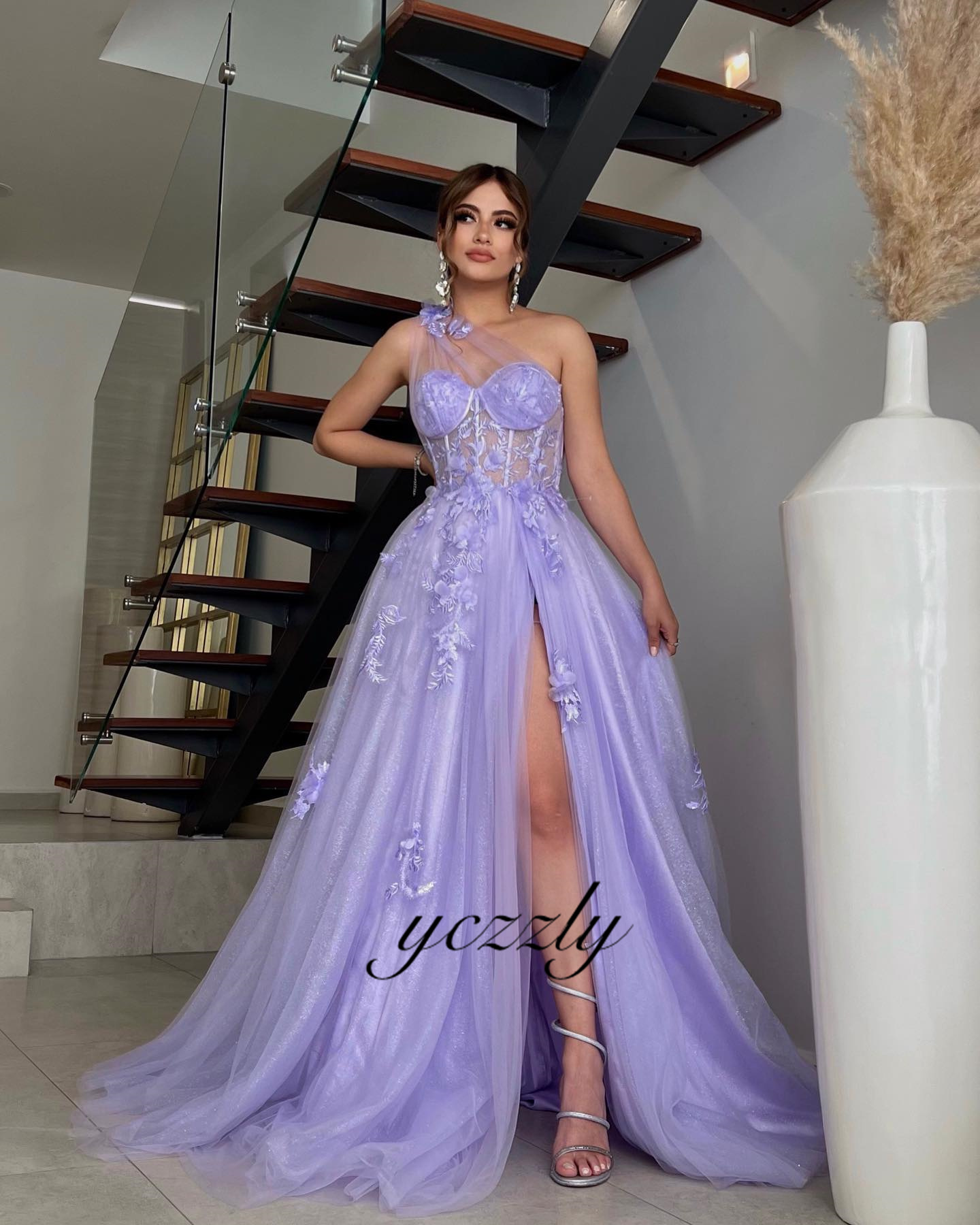 Purple One-shoulder Appliqued Prom Dresses With High Slit YE09