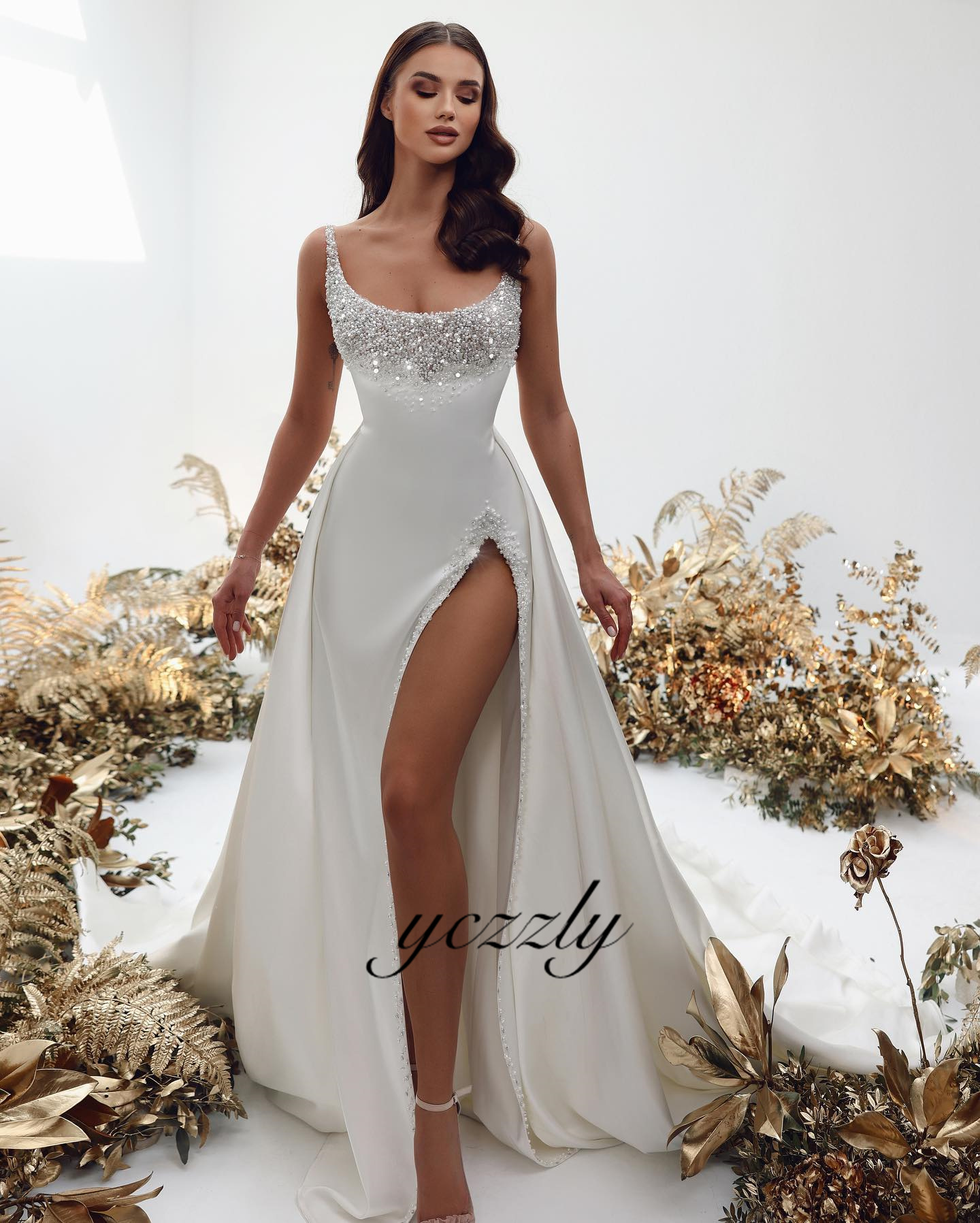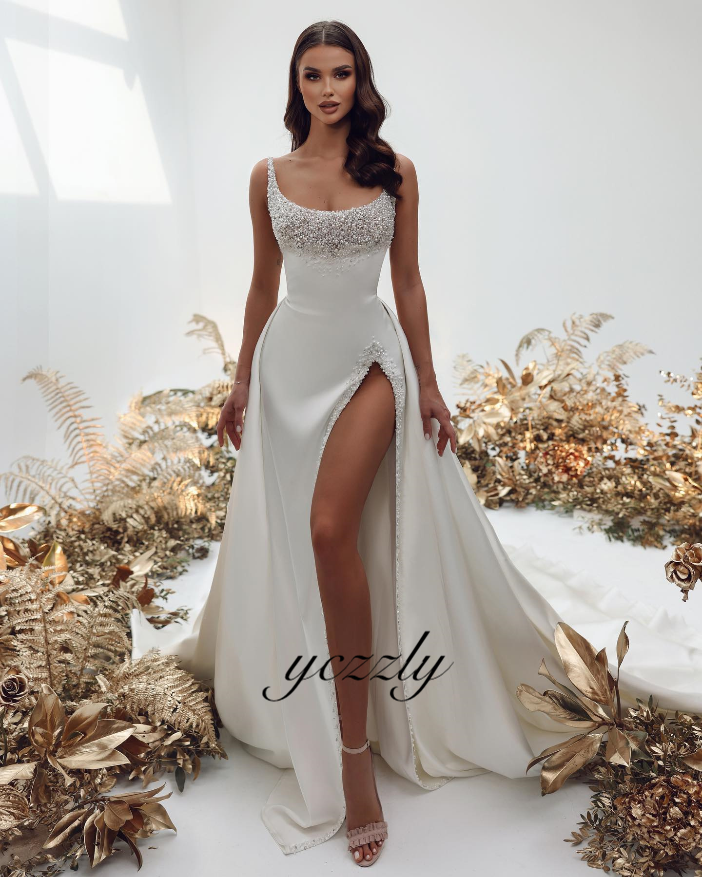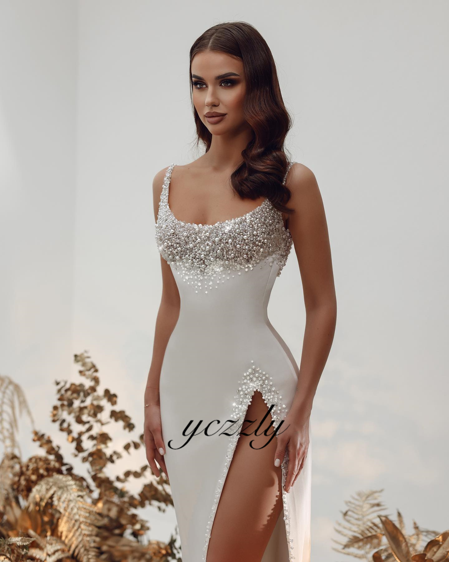 Luxury Square Neckline Pearls Mermaid Prom Dress Long Straps Diamond Satin Evening Prom Gown With Slit YE11