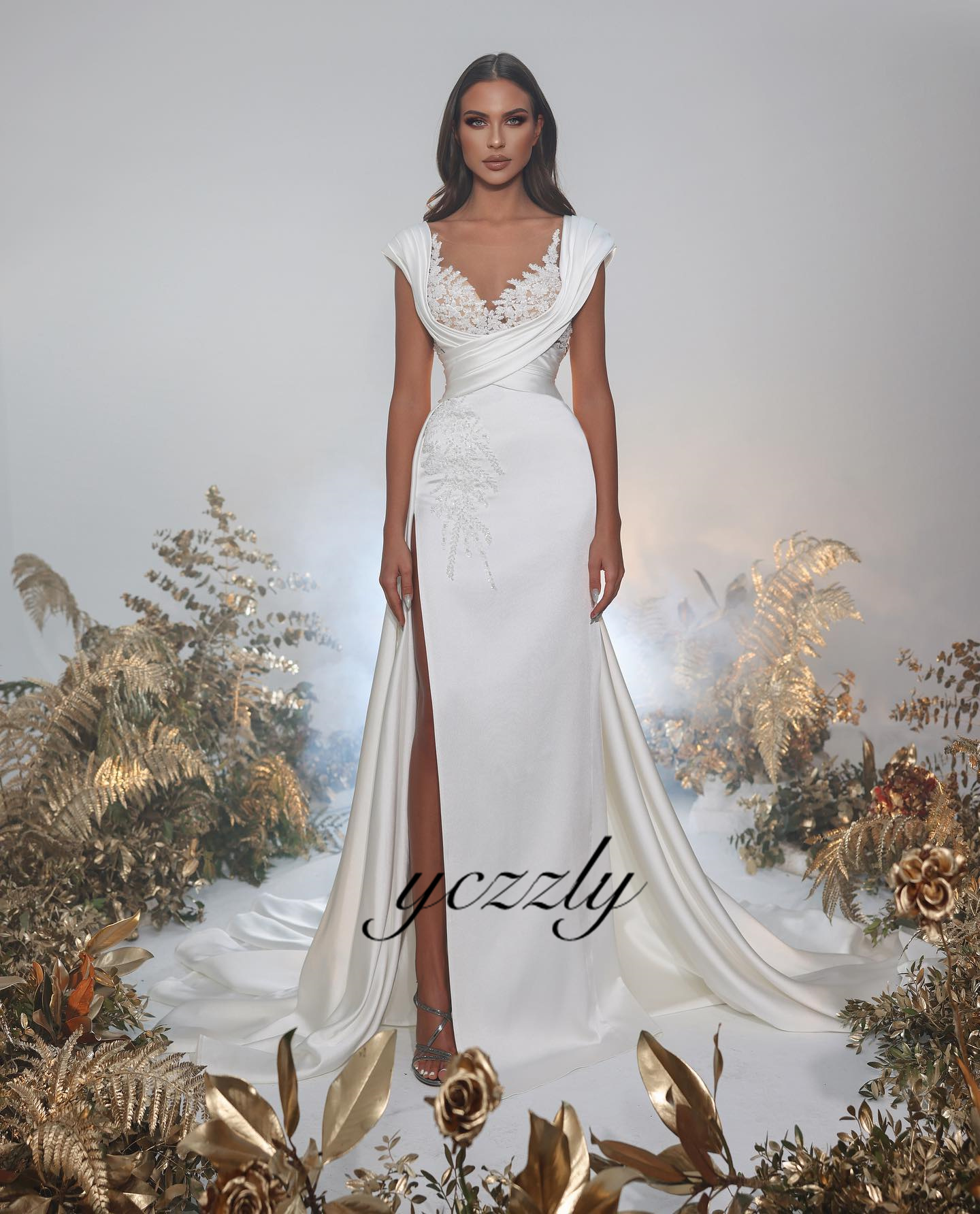 Ivory Sweetheart Satin Appliqued Sleeves Prom Dress With Slit Long Train Prom Gown YE12