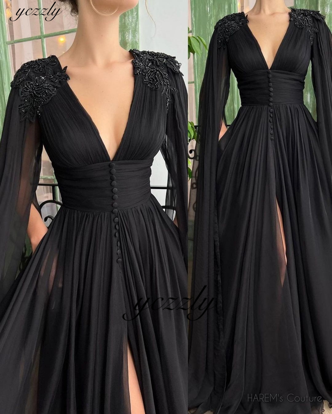 Black Plunging V-neck Chiffon Beading Prom Dress With Middle Slit YE13