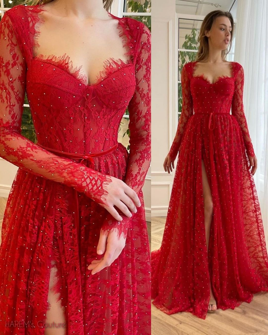 Red Lace Sweetheart A-line Long Sleeves Prom Dress With Beads YE16