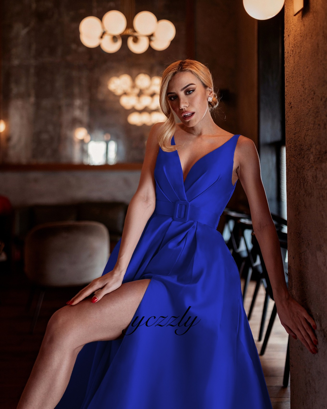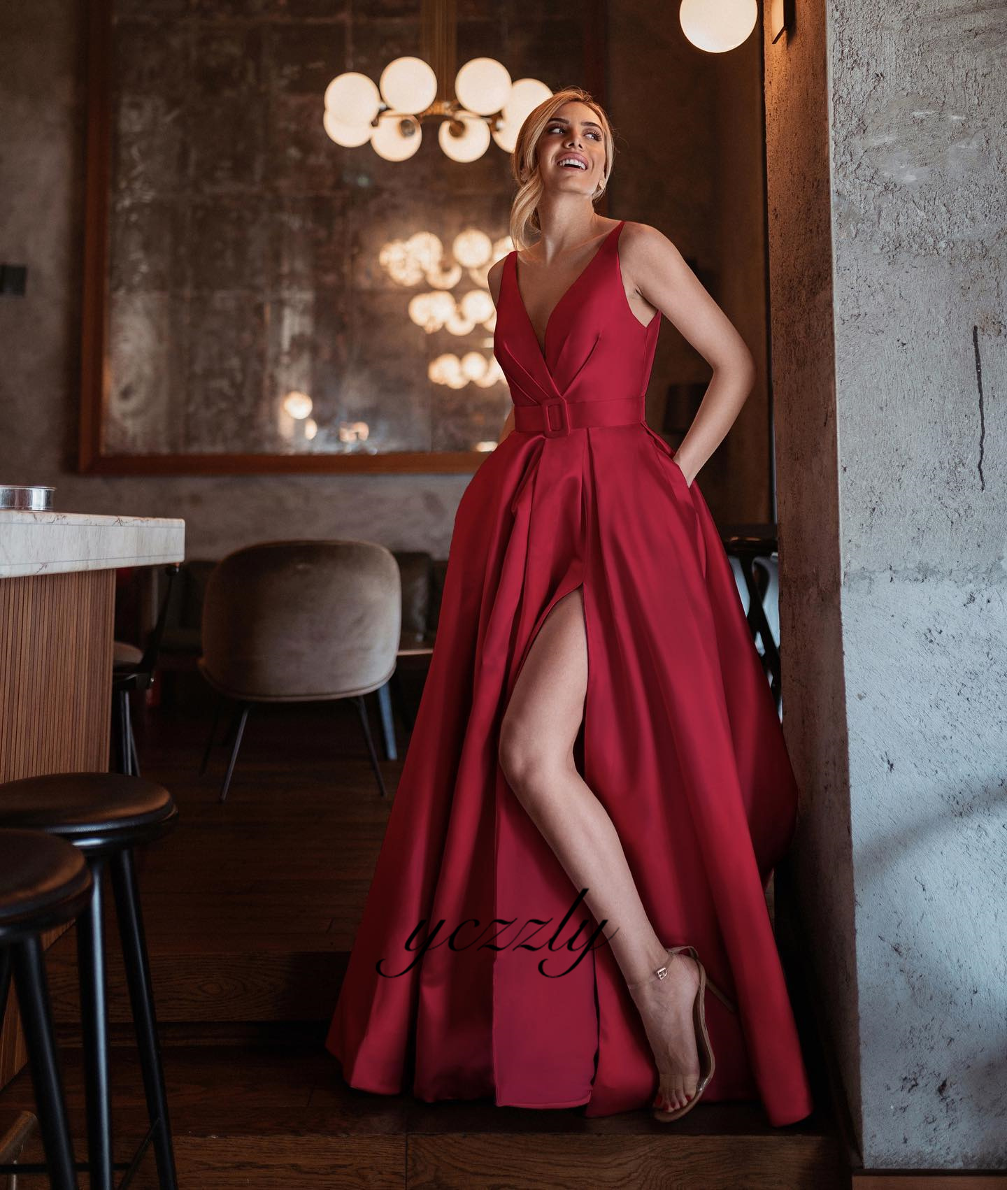 Burgundy V-neck Satin Long Prom Dress With Slit YE24