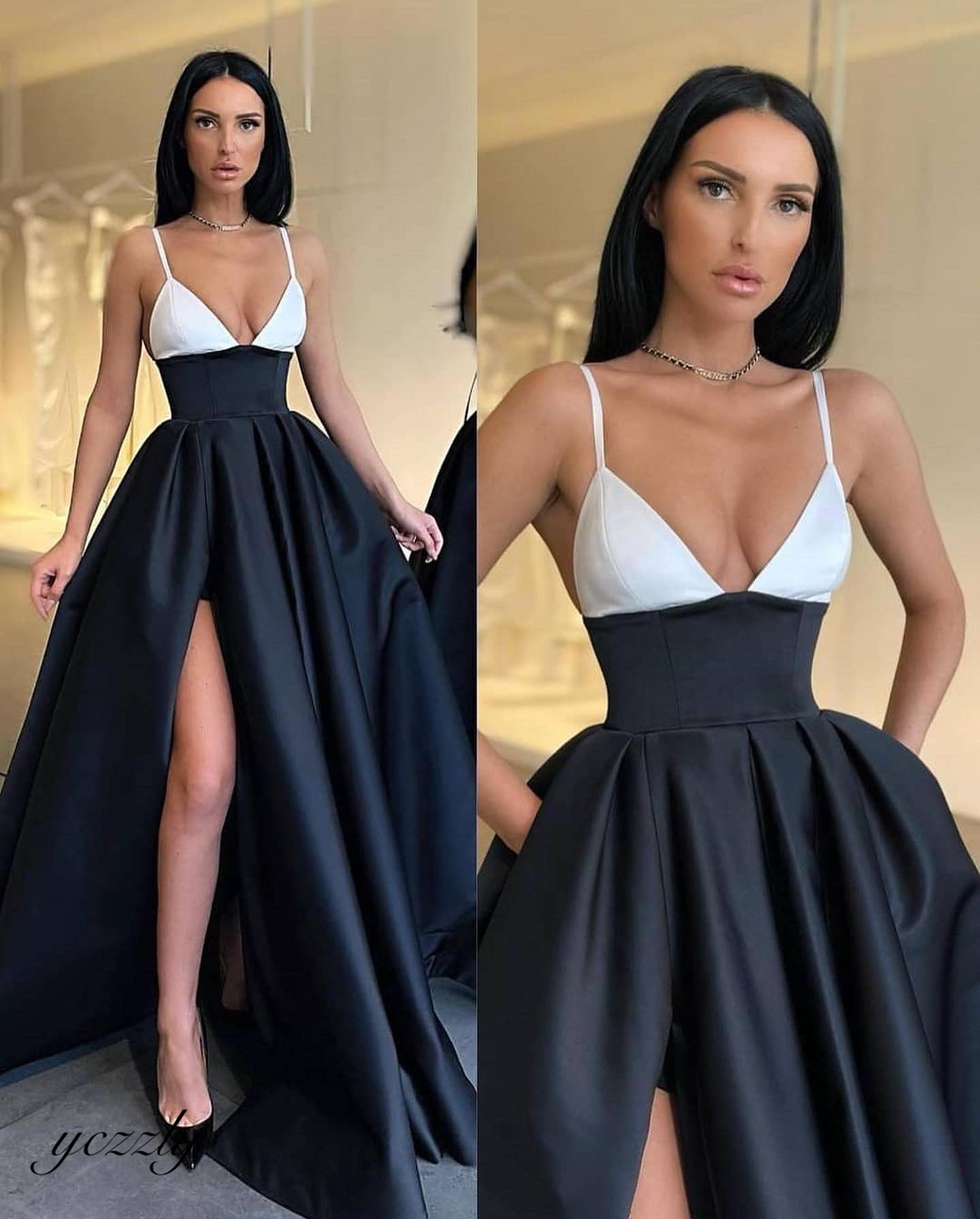 White&Black Spaghetti Straps Satin Prom Dress With Slit YE33
