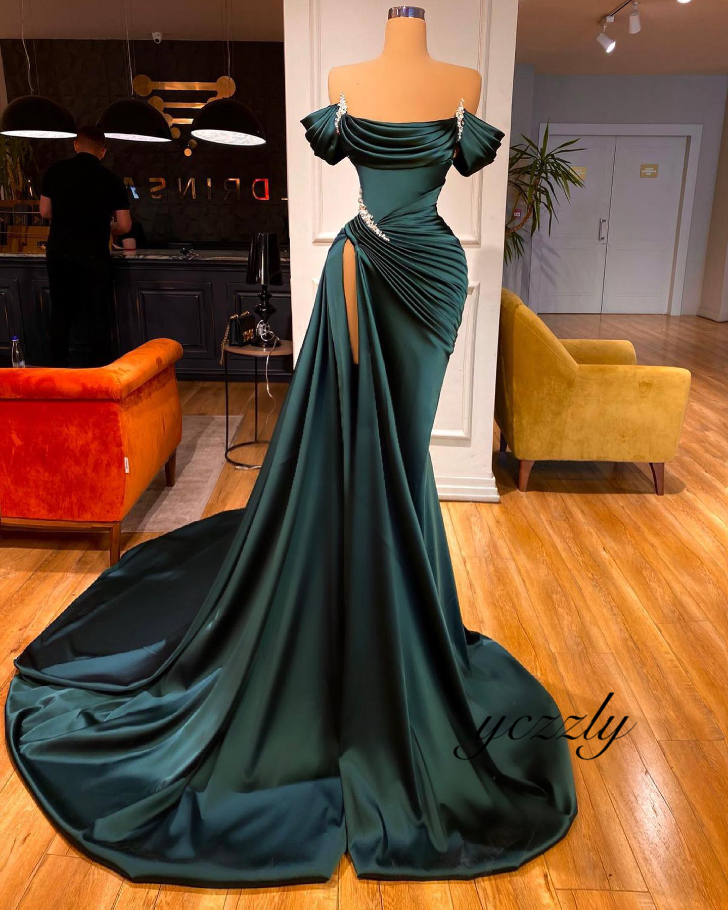 Dark Green Off theShoulder Satin Mermaid Prom Dresses With Slit YE35